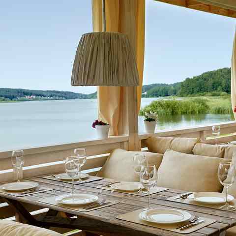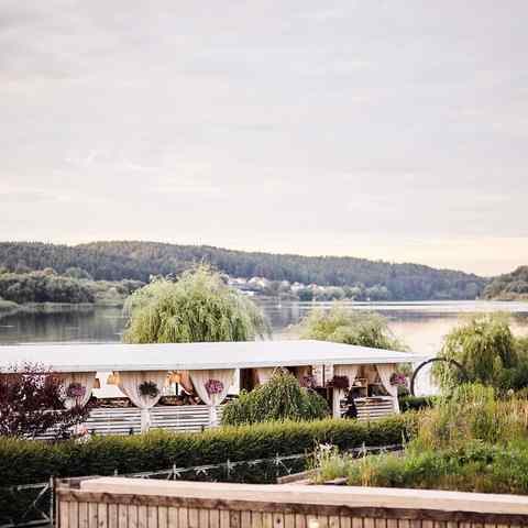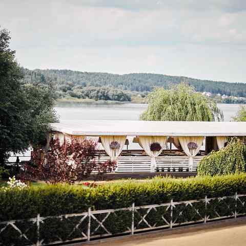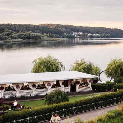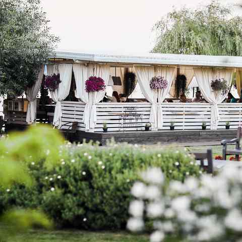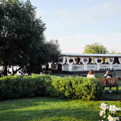 Праздновали свадьбу на втором этаже. Зал очень красивый, расположение ресторана шикарное, на этом положительные моменты ...закончились. Еду назвать вкусной сложно, тарталетка с жульеном хороша. Первое горячее подали слегка теплым. Второе горячее шашлык и овощи гриль вообще холодным. В простой столовой думаю так бы не подали. Кондиционер не вывозит, очень душный зал с закрытыми окнами, а на улице всего 23 было. Чай кофе не подали к торту, мол сотрудники уже сдали кассу и после 23 00 чай кофе не подают. Ещё не понятно почему за стол молодоженам не принесли торт, за одним из столиков люди тоже остались без торта, гости самостоятельно ходили и просили у официантов. Салфетки не обновляли ни на столах, ни в туалетах. Лужайка для выездной регистрации наполовину затоплена (хотя дождя не было), по какой причине не понятно. И на финал ресторан за два дня до свадьбы решил откатать канализацию, запах, естественно, остался и лёгкий аромат сопровождал свадьбу. Ну и двери без ручек отдельно стоят внима